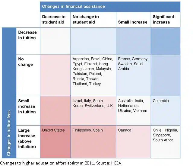 Below is an excellent graphic featured in the HESA report that combines tuition fee changes with changes to financial assistance to students in order to arrive at the overall affordability of various markets. As you can see, the US emerges (in red) as the country in which affordability is decreasing the most dramatically. Other leading study abroad destinations (e.g., Canada and the UK) are also becoming more expensive, but not at the same rate as the US.