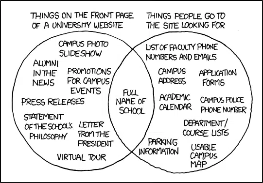 The questions about what students consider a good web experience really got going in 2010 with a cartoon by Randall Munroe’s web comic “xkcd.” It shows a Venn diagram exposing the difference between what a typical university would put on their home page ("Things on the front page of a university website") and what student visitors would like to see there ("Things people go to the site looking for"). The only thing common to both circles was the actual name of the school.