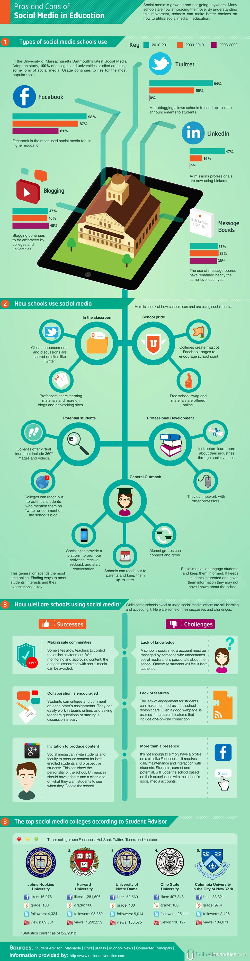 Today we share two infographics below that illustrate how schools have fared with social media over the last few years — what platforms are best, where they’ve succeeded, and the challenges that lay ahead.