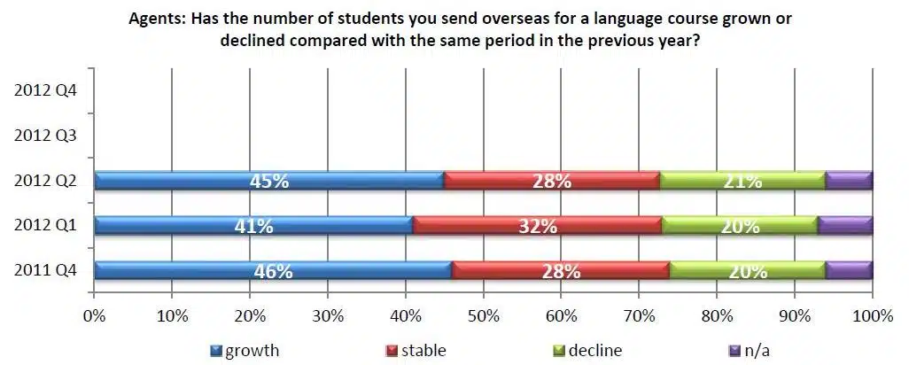 The Association of Language Travel Organisations (ALTO) has released its latest report from Q2 2012, which includes feedback from 229 language schools and 399 educational agencies around the world. ALTO regularly provides a snapshot of the language travel industry and predictions for the upcoming quarter via its report, ALTO Pulse. Less than half of the language schools and agents reported growth in the last quarter, and overall performance has been on a downward trend since the report from Q4 2011. Reasons for the drop are mainly attributed to tightened visa restrictions in the UK and this summer's Olympic Games in London, as well as continuing economic challenges in some countries. One participant summed it up as follows:
