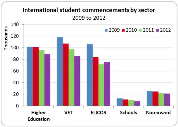 “In 2012, there were 515,853 enrolments by full-fee paying international students in Australia on a student visa. This represents a 6.9% decline on 2011 and contrasts with the average annual growth rate for enrolments since 2002 of 6.5% per year. There were 279,335 commencements in 2012, representing a 5.6% decrease over 2011 compared with an average annual growth rate for commencements since 2002 of 5.7% per year.”