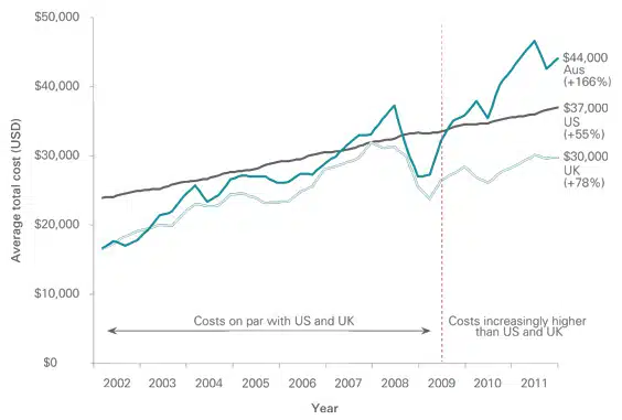 The report also provided a chart (which we have included below) showing that from 2009 onwards, Australia has lost its historic price advantage over other leading competitors such as the US and the UK.