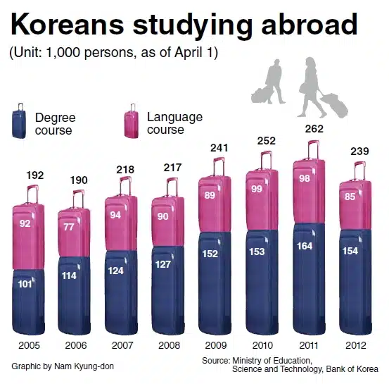 Recent data from the South Korean Ministry of Education and the private education group Etoos reveals that fewer South Korean students are opting for overseas study. The latest Open Doors data confirms this as well, registering 73,351 students in the US from South Korea in 2010/11 compared to 72,295 in 2011/12 – a drop of 1.4%. Although this is not a massive figure, mobility shifts can have a significant effect on countries that recruit heavily from South Korea, such as the US, where they make up almost 10% of the total international student body. South Korea is also a top sender of students to Canada, as well as to regional spots like China and Japan. Reports indicate that this shift is occurring due to a declining birth rate (the number of high-school graduates is expected to drop from 670,000 in 2012 to 410,000 in 2024) and an economy that is losing middle class families. More specifically, the proportion of middle class households in South Korea shrank from 75.4% in 1990 to 67.5% in 2010, according to an August 2013 report by the global consulting firm McKinsey. McKinsey attributes this decline partly to a shrinking number of high-paying jobs with major business conglomerates, a trend that has led to a standstill in middle class income growth. The report also warns that half of all middle class South Korean households now risk falling into poverty. With income growth stalled, international schooling is increasingly unaffordable for middle class families. A report put together by the Bank of Korea showed that approximately 154,000 students were pursuing degrees at overseas universities in 2012, a 6% drop from 2011 (see the graphic below). Oh Jong-un, evaluation director at Etoos, told the Korea Joongang Daily earlier this year,