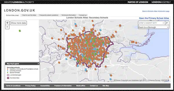 The London Schools Atlas is a great place to start in our consideration of the data-enabled online tools now available to students and their families researching educational choices. The Atlas is an interactive online map that reveals: