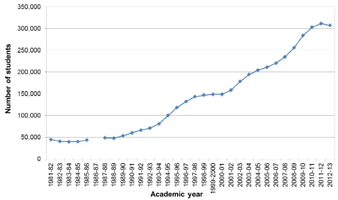 HEFCE reports that undergraduate students from Hong Kong – who could not be accommodated in local schools (see this article for more on Hong Kong) – and from Brazil – who more than doubled to reach 500 largely as a result of the Science Without Borders programme – were positive factors in England’s overall higher education enrolments. According to overall immigration data (which does not separate higher education from other areas of English education), China, Hong Kong, and Malaysia are continuing to drive international enrolments in Britain. HEFCE points to Malaysian growth being in part attributable to a simplified visa application process for students seeking study at universities with “highly trusted sponsor status” in 2012 (again, pointing to the huge significance of a country’s visa policies to its popularity as a study destination). Chinese students, who are the largest group of international students at UK universities, grew by 6% (56,535) in 2012/13. There was a surge in Indonesian students (albeit from a low base) being issued British visas between July and and December 2013. The expectation is that this growth is related to the Indonesian-UK DIKTI scholarship programme for post-graduate students, primarily at doctoral level.