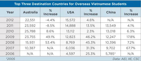 Australia is the number one study destination for Vietnamese students according to World Education News and Reviews (WENR). “In 2012, the nation’s institutions of education hosted 22,551 Vietnamese students, which is a significant drop from the almost 26,000 students who were in Australia in 2010, but still way higher than the 10,387 students enrolled in 2007. Current visa statistics suggest that Vietnamese numbers are set to rebound, with March data showing student visa applications up 36% and grants up 56% versus the same time last year.” Vietnamese students reportedly regard higher education in the US as “the best in the world” and “as a priority worthy of significant financial investment.” A 2010 survey undertaken by the Institute of International Education (IIE) found that Vietnamese students perceive the US as a scientifically and technologically advanced country with a top-notch education system. Cost appears to be the main obstacle preventing a greater number of Vietnamese students from pursuing studies in the US. The IIE survey indicates that the US is perceived as being more expensive than alternate destinations such as Singapore or Australia.