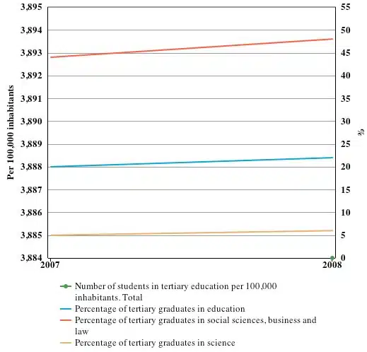 UNESCO data, below, shows that social sciences/business/law programmes are the most common fields in which Ecuadorians graduate, with just under 50% of all students opting for those paths. That group is followed by education in a distant second place at about 23%. UNESCO’s most recent information on this subject dates from 2008.