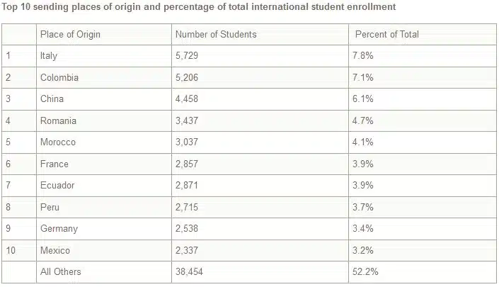 In 2012/13, total international student enrolment in Spain was 73,639. The strongest senders to Spain - as seen in the chart below - were Italy, Colombia, China, Romania, and Morocco.