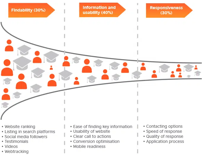 The research process resulted in a score (out of 100) for each institution. Scoring was based on a set of 40 ranking factors, grouped broadly under headings of “findability”, “information and usabilty”, and “responsiveness”.