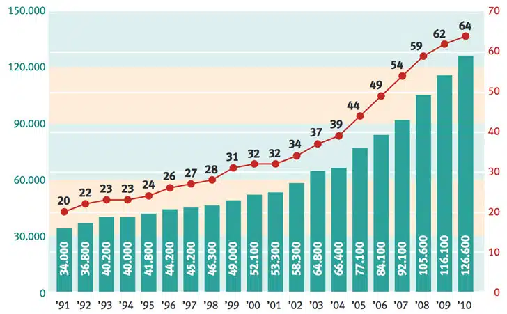 Recent data from the German Academic Exchange Service (DAAD) points to a significant increase in the number of German students going abroad. The number of German students enrolled outside of Germany has increased by nearly 400% over the last two decades, from 34,000 in 1991 to 134,000 in 2011.