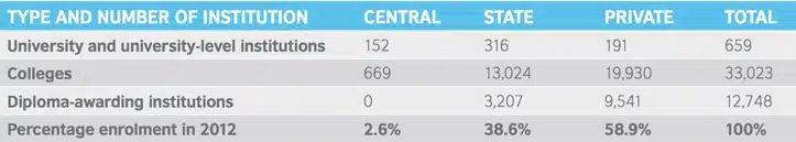 All of these ambitious and interrelated goals are amplified by the fact that the Indian system is massive. There are approximately 650 universities and more than 40,000 colleges and diploma-granting institutions. This large institutional field can be further categorised by funding source, whether central (e.g., national) government, state, or private. The following table gives a breakdown of all institutions, and the share of enrolment for each, as of 2012.