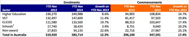 - ELICOS also showed especially strong growth. YTD November 2014 enrolment was up 19.7% over the same period for 2013 and commencements grew by 17.4% year-over-year.