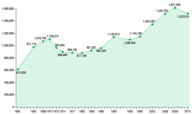 The survey found that US enrolment in foreign-language studies fell by 6.7% over those five years. “Thus ending a steady rise in enrolments since 1980 (with the exception of a slight dip in 1995)." As the following chart reflects, overall enrolment in US foreign-language programmes grew from 877,186 in 1980 to a peak of 1,621,059 in 2009, before dipping to the latest-reported levels in 2013.