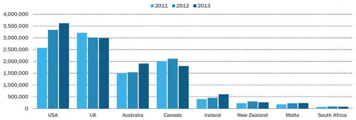 Italy remains the most important sending country for Malta, responsible for a 13% share of student weeks (up from 10% in 2013). Russia is next at 12% but its share fell from 15% in 2013 (representing a decrease of nearly 7,000 students year over year).