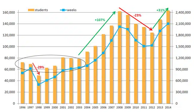 The 2014 results mark another important step in Australia’s continuing recovery from recent-year declines in ELICOS numbers. The number of English language students in Australian programmes doubled in the five years from 2003 to 2008, but then declined by nearly a quarter (-23%) from 2009 to 2012.