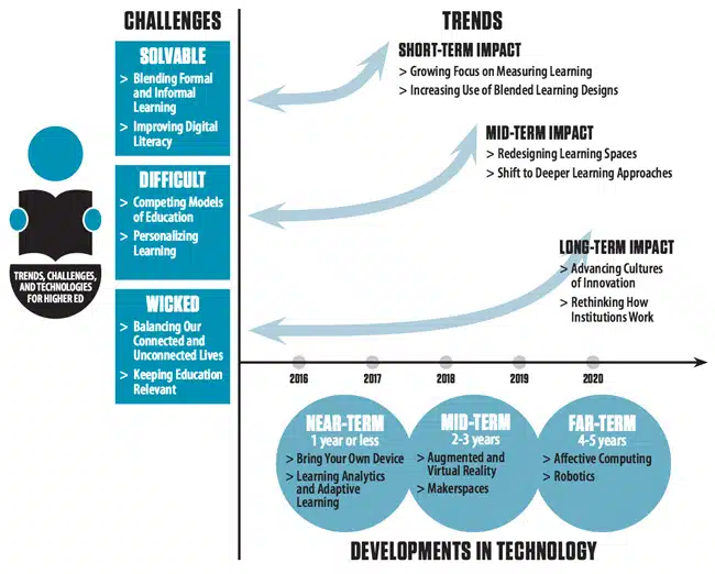 The report astutely observes that the adoption of emerging technologies in higher education comes down to an interplay among three points: policy, leadership, and practice. For example, analysts and researchers working in the higher education field have for several years been warning that the traditional university model is not sustainable, for all the reasons mentioned above and more. The NMC Horizon Report: 2016 Higher Education Edition notes that: