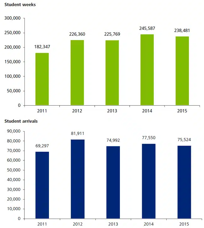 The following graphs reflect a longer-term trend of fluctuating student numbers - which, at 75,524 for 2015, remain off the recent-year peak of 81,911 in 2012. They illustrate as well a general upward trend in total student weeks, with some marginal year-over-year declines, as is the case this year, which offset years of more substantial growth.