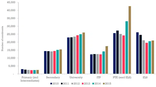 ITP enrolment climbed by nearly 42% over the two years, and by 23% between 2014 and 2015 alone. The PTE sector includes language schools and, while English Language Teaching (ELT) enrolment has been essentially flat over the last two years (+2% between 2014 and 2015), overall PTE numbers are up by more than 45% (including nearly 19% between 2014 and 2015).