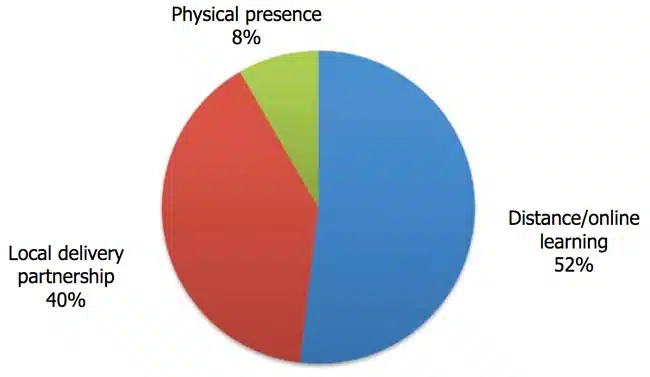 The HEGlobal study reframes this broad definition into three distinct categories of TNE: local delivery partnership, physical presence (referring mainly to international branch campuses, or IBCs), and distance or online provision. The following chart shows the breakdown of British TNE enrolment in the top five offshore markets across these three categories for 2014/15.