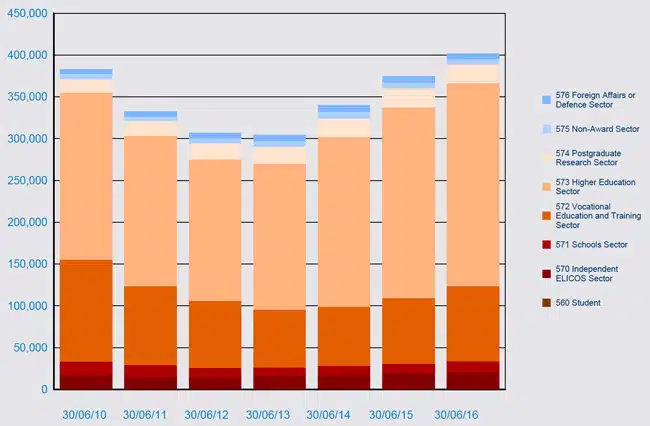 This perspective may in fact provide a more meaningful measure of year-over-year changes in actual student numbers in Australia, and the DIBF report reflects the same steady growth in enrolment that we have observed otherwise from 2013 on. As the following chart reflects, the total number of visa holders reached 401,423 on 30 June 2016. This represents year-over-year growth of 7.17% over the same enrolment snapshot for 30 June 2015, and marks a third consecutive year of growth, building on a 11.67% increase from 2013 to 2014 and another 10.24% bump from 2014 to 2015.