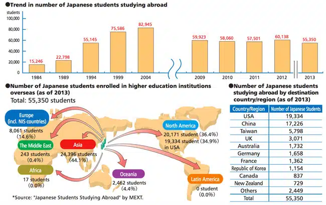 Japan’s Ministry of Education, Culture, Sports, Science and Technology (MEXT), for example, reports that outbound numbers have declined nearly every year over the past decade from an historic high of about 83,000 students in 2004 to 53,350 as of 2013.