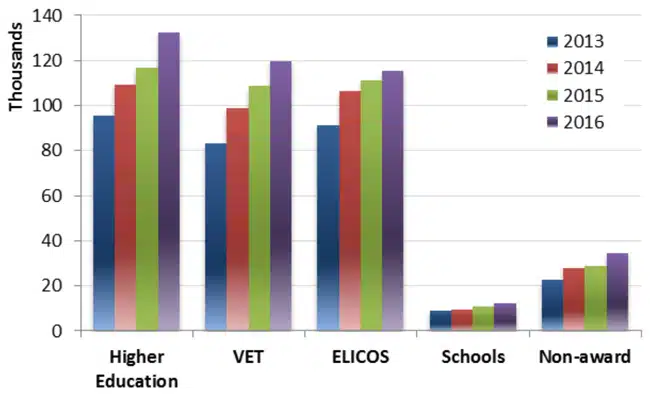 International student commencements by sector, 2013-2016. Source: Australian Department of Education and Training