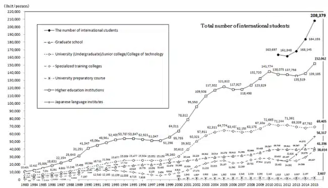 Total foreign enrolment in Japan and enrolment by level of study, 1983–2015. Source: JASSO