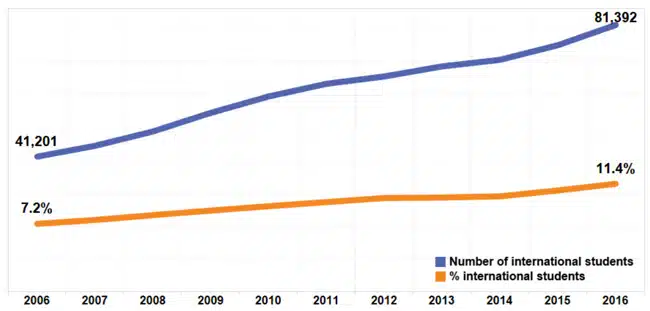 Total enrolment of international degree-seeking students and their proportion of total higher education enrolment in the Netherlands, 2006-2016. Source: Nuffic