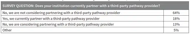 Nearly two-thirds of respondents (64%) said they were not considering a third-party pathway, while 18% indicated they were currently partners and another 13% said they were considering such a partnership in the future. Of those not currently partnered, 10% said that they expected their institution would establish a third-party pathway programme within the next three years.