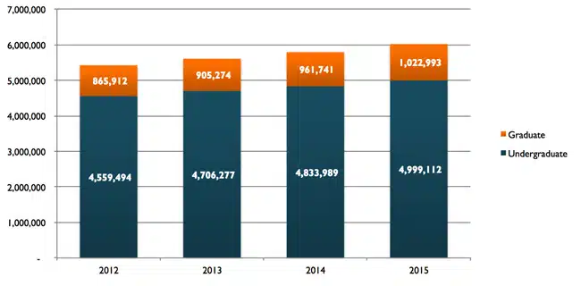 Total enrolment in US higher education, 2012–2015. Source: Digital Learning Compass
