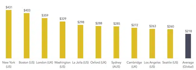 As the following chart reflects, New York City was ranked as the most expensive city in the study, with students spending nearly double the global average for accommodation. Other major US and UK destinations – Boston, London, and Washington – follow close behind with weekly average rents again well above the global benchmark.