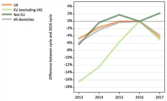 This reflects a 4% drop in UK applicants but also a 5% decline in applications from students from other EU countries. That shortfall in EU admissions files was only partly offset by a 2% increase in applications from foreign students outside the EU.