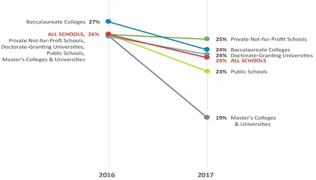 In an admissions context, “yield” refers to the percentage of admitted students who actually enrol, and, as such, it is a key metric in enrolment management. The 165 institutions who responded to the May 2017 survey represent only a fraction of the more than 4,000 higher education institutions in the US, but the survey nevertheless provides an important window into emerging trends for 2017/18.