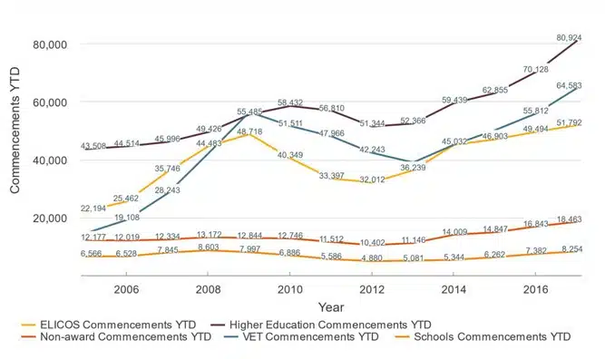 International student commencements in Australia, by education sector, 2006–2016. Source: English Australia, DET