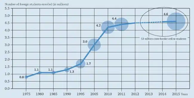 “The increase in foreign enrolment has been driven by a variety of domestic and external, push (encouraging outward mobility) and pull (encouraging inward mobility) factors,” says the OECD. “The skills’ needs of increasingly knowledge-based and innovation-driven economies have spurred demand for tertiary education worldwide, while local education capacities have not always evolved fast enough to meet a growing domestic demand. Rising wealth in emerging economies has further prompted the children in a growing middle class to look for educational opportunities abroad. At the same time, factors such as economic (e.g., costs of international flights), technological (e.g., the spread of the Internet and social media to maintain contacts across borders) and cultural (e.g., use of English as a common working and teaching language) have contributed to making international mobility substantially more affordable and less irreversible than in the past.” At the same time, the OECD report highlights a number of important trends that are acting on the scale and shape of international mobility today, including an expansion of transnational education provision, the rapid adoption of online teaching and learning, and the emergence of major regional study destinations in Europe and Asia. “The global marketplace for tertiary education is likely to expand further as global demographic trends and a rising global middle-class spur demand and spending on educational products and services. Information and communication technologies (ICT) are also instrumental to this expansion,” concludes the report. “ICT not only reduce migration costs, but also increase the reach of domestic education. There are already an estimated 13 million cross-border online students, though the impact on the scope and patterns of international student mobility remains unclear.” Other factors that will bear on the longer-term growth trend toward that projection of eight million internationally mobile students by 2025 include:
