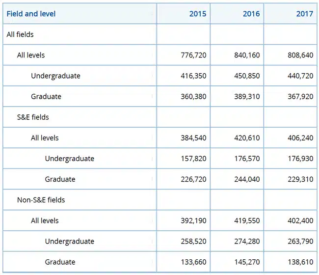 The NSF analysis takes this a step further still by isolating F-1 visa holders (that is, those enrolled in higher education institutions for long-term degree study). It again finds that after years of steady growth, total foreign enrolment in US higher education dipped from 2016 to 2017. As the following table reflects, total international enrolment (that is, both undergraduate and graduate) fell by nearly 4% last year. Undergraduate numbers dipped by just over 2%, and graduate enrolment fell off more sharply with a nearly 5.5% decline.