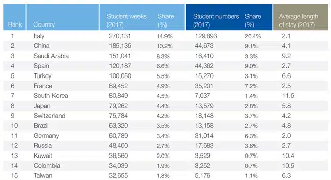 Nearly 60% of all ELT students in the UK come from the European Union, and from Italy, Spain, France, and Germany in particular. Owing to the longer stay of non-EU students, however, roughly two thirds of all student weeks for 2017 were attributed to students from outside the European Union. In 2017, the average stay for non-EU students, at 5.5 weeks, was more than twice that of the average 2.3-week stay for those from within the EU.