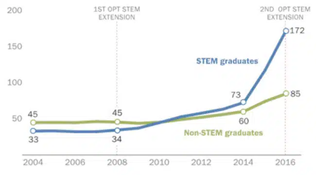 As the following chart reflects, the effect on STEM OPT numbers has been profound, with the number of STEM graduates in OPT placements increasing by 400% since the first extension was announced in 2008.