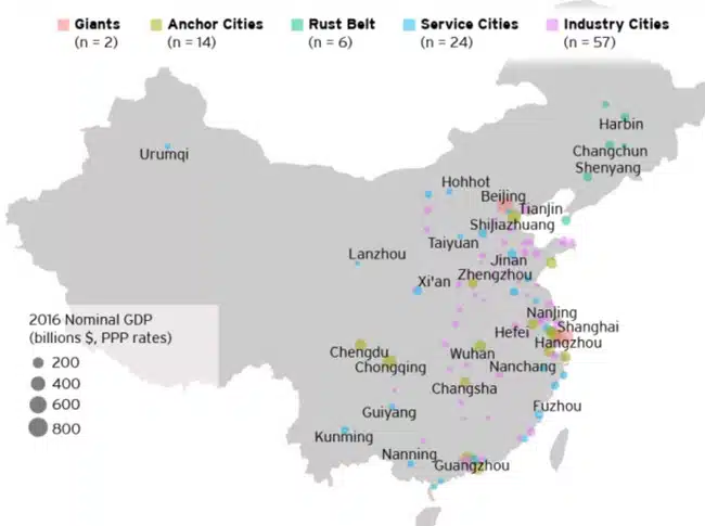 - "Anchor Cities": A next tier of 14 large cities that together account for about a quarter of China's GDP: Tianjin, Chongqing, Zhengzhou, Nanjing, Hangzhou, Guangzhou, Wuhan, Changsha, Chengdu, Qingdao, Suzhou, Wuxi, Ningbo, and Shenzhen.