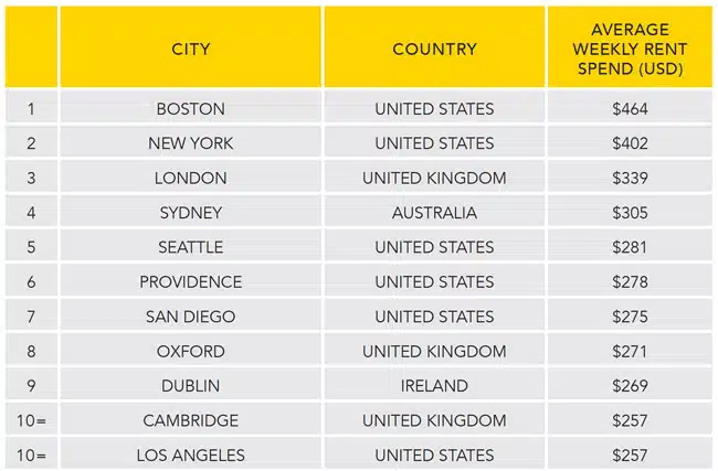 Boston takes over the number one spot as the most expensive city this year, with New York, London, Sydney, and Seattle rounding out the top five. As the following table reflects, weekly rents in each of those destinations range from roughly US$300 and above.