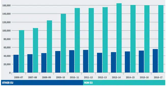Growth in EU, non-EU, and total international enrolment in UK higher education, 2006/07–2016/17 – where 2006/07 is the baseline value (100). Source: HESA, UUKi