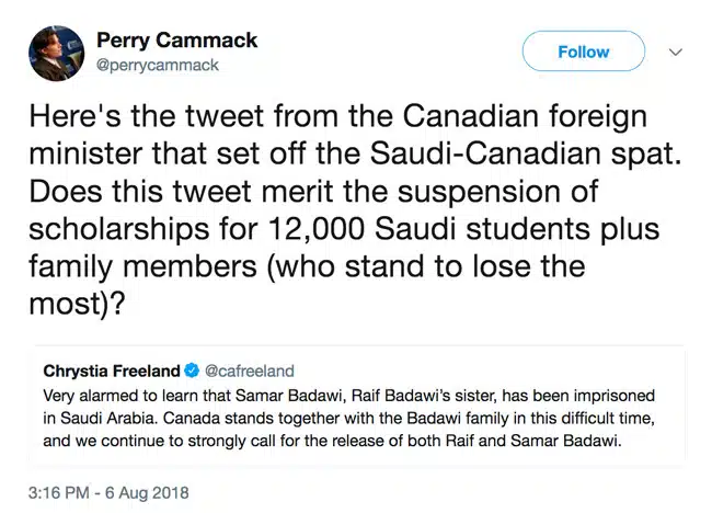 Minister Freeland’s original Twitter post, along with a commentary from Perry Cammack, a fellow in the Middle East Programme at the Carnegie Endowment for International Peace