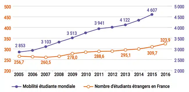 The two charts that follow tell the story of this growth dynamic. In the first, we see the growth in international enrolment in France since 2005 weighed against global growth in student mobility. In the second, we see the share of internationally mobile students hosted by France, again since 2005, in the context of that global growth.