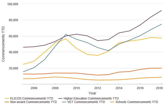 A closer look reveals, however, that it is the higher education and VET sectors that are driving nearly all of that growth this year, with overall year-over-year increases of 15% and 14% respectively through June 2018.