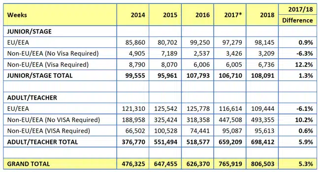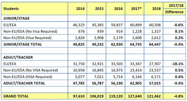 As the tables highlight, junior numbers (including stage programmes for closed groups) held fairly steady in 2018, but the number of adult learners, especially those from within the EU, were down more sharply.