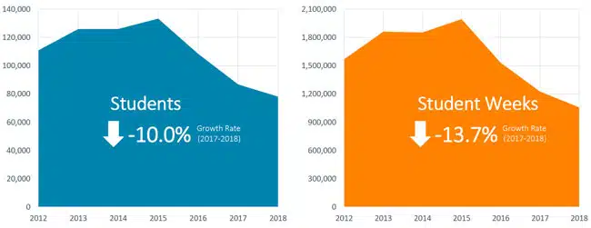 The declines mark the third year of a downward trend in the US English-language training sector in the US. From a historic high point in 2015, IEP numbers in the US have declined by nearly 42% overall – and student weeks by 46% – through 2018.