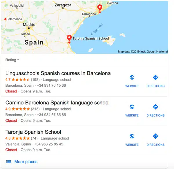 Already, pre-Super App, agents and educators are well advised to have a Google business listing if they want to be more readily discovered by students. The following image says it all: enter “language schools in Spain” and this Google Maps-linked list is what will appear on the first page of your search: schools that have listed their businesses with Google (and invested in SEO advertising).