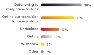 But other findings add nuance to the story; as IDP Connect CEO, Simon Emmett, says, they reveal that there’s only a short window of time left to keep students’ hopes and plans intact. That’s because there’s limited appetite for beginning studies online with the hopes of eventually travelling to a physical campus: 31% said they would, while 38% said they would rather defer their start date to be able to study face-to-face (i.e., with no online component). The proportion of postgraduates preferring to defer entry was significantly larger than it was among undergraduates.