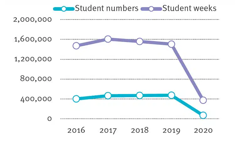Student weeks were down by 71% and the number of students plummeted by 84% in English language schools in the UK in 2020, according to the latest data from BONARD for English UK. These figures are even more worrying than the ones included in an earlier analysis, and some schools have not been able to endure the downturn from the pandemic. English UK notes,