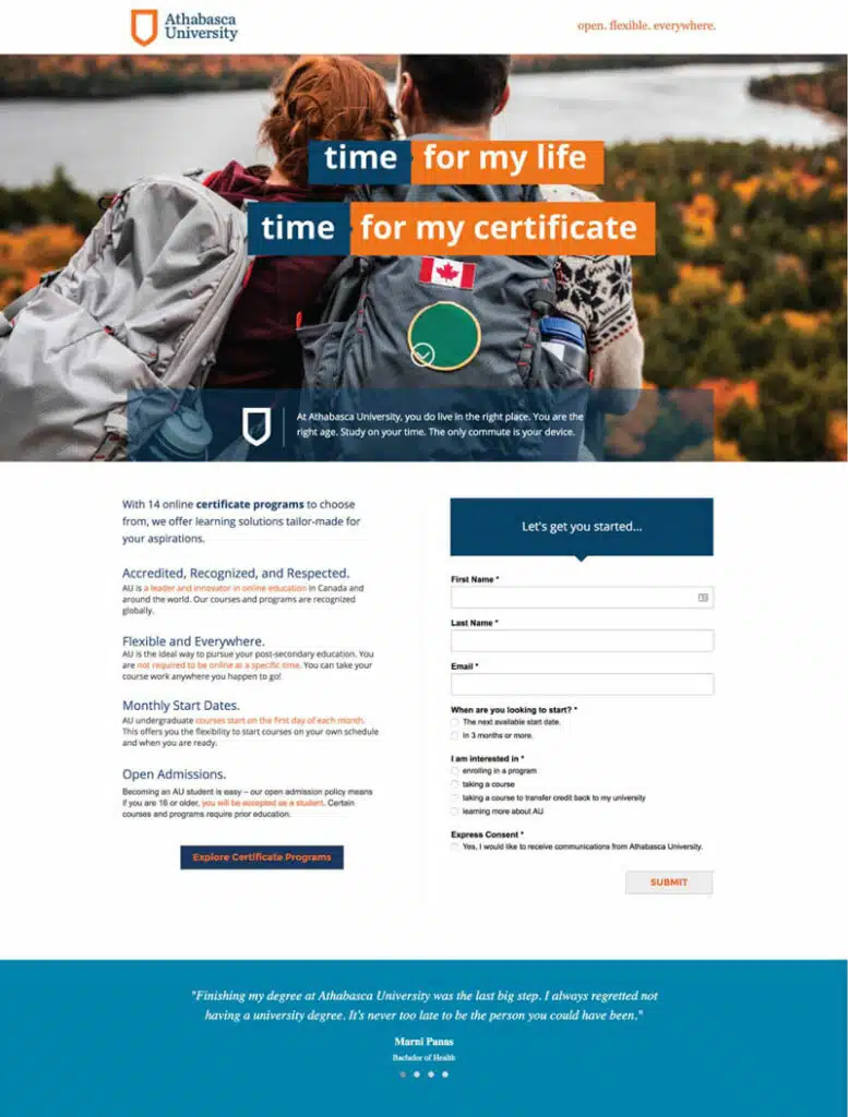 The landing page that Unbounce designed for Athabasca University (below) shows how such a request for email can be structured to allow students to plug in vital information that Athabasca can then use to personalise their email communications. On top of that, when students submit the form, Athabasca staff receive crucial information such as when students are hoping to start a programme – knowledge that has never been more important than during all the deferral activity created by COVID.